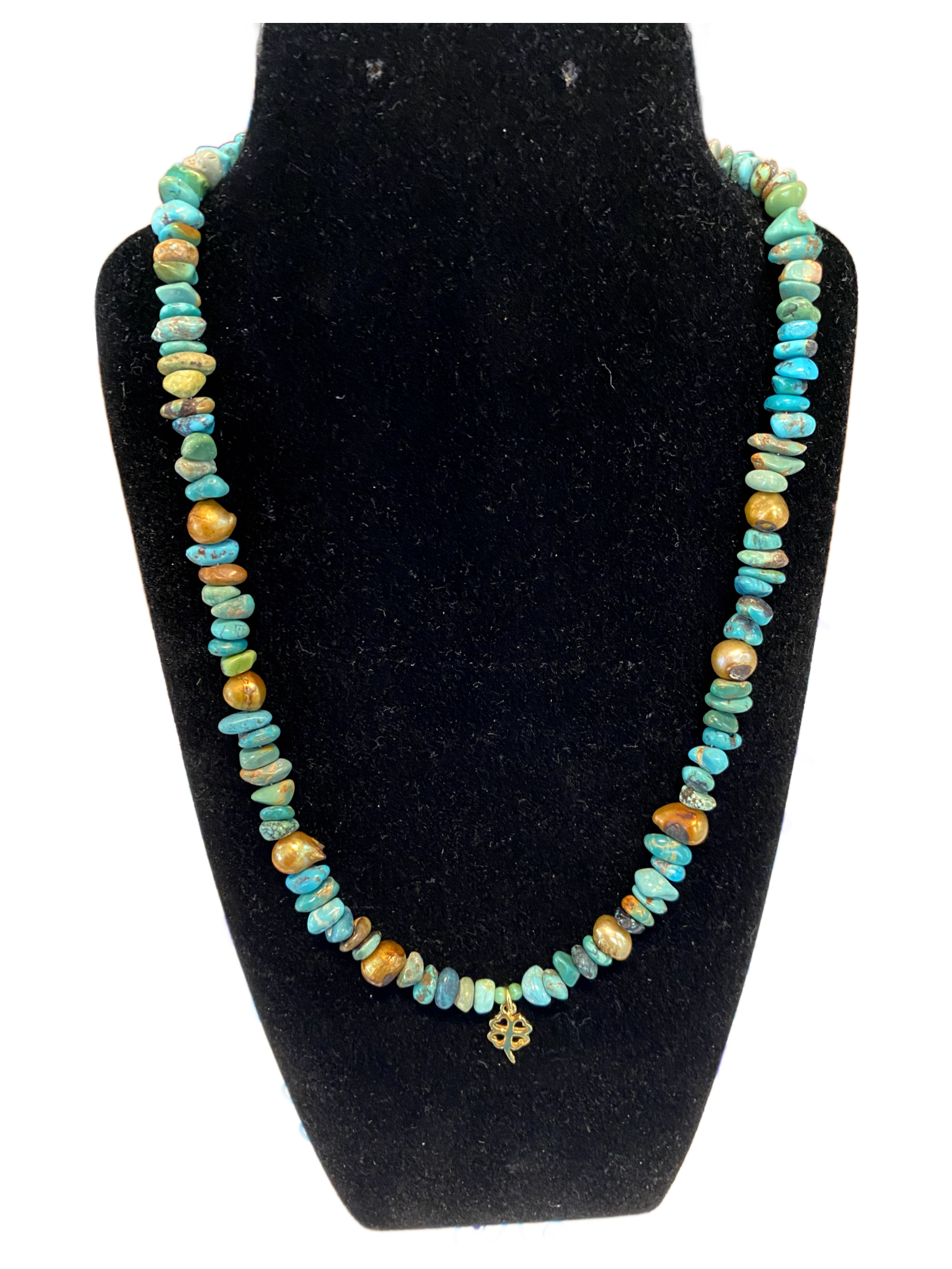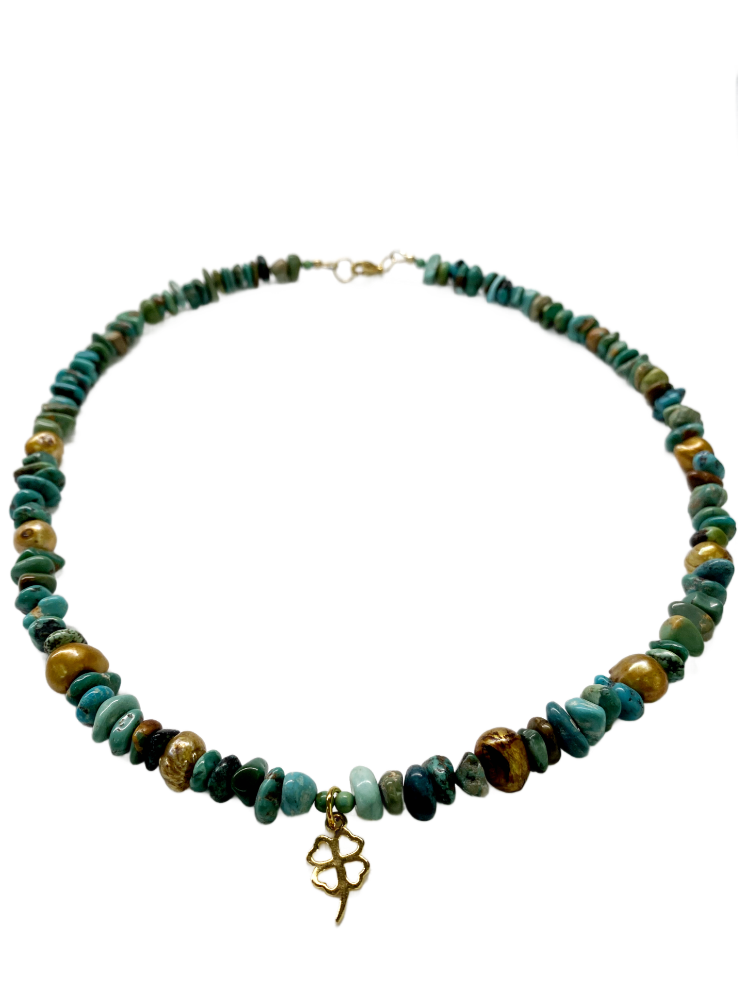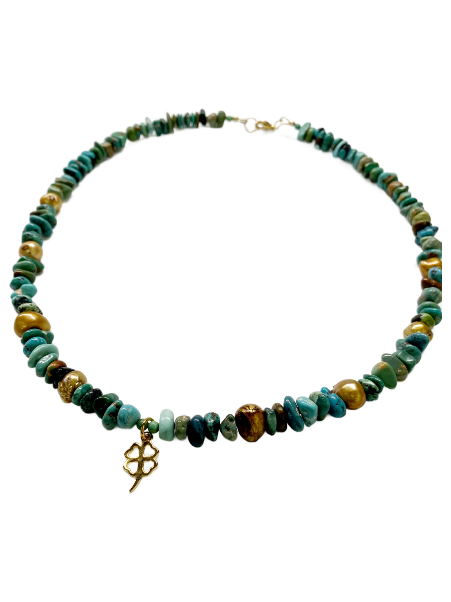 The Lucky Lady Necklace showcases a 14 kt goldfilled clover pendant, intricately beaded with natural turquoise and pearls. This expertly crafted piece combines the durability of goldfilled metal with the unique beauty of genuine stones, offering a sophisticated accessory that enhances any ensemble with elegance and natural allure.