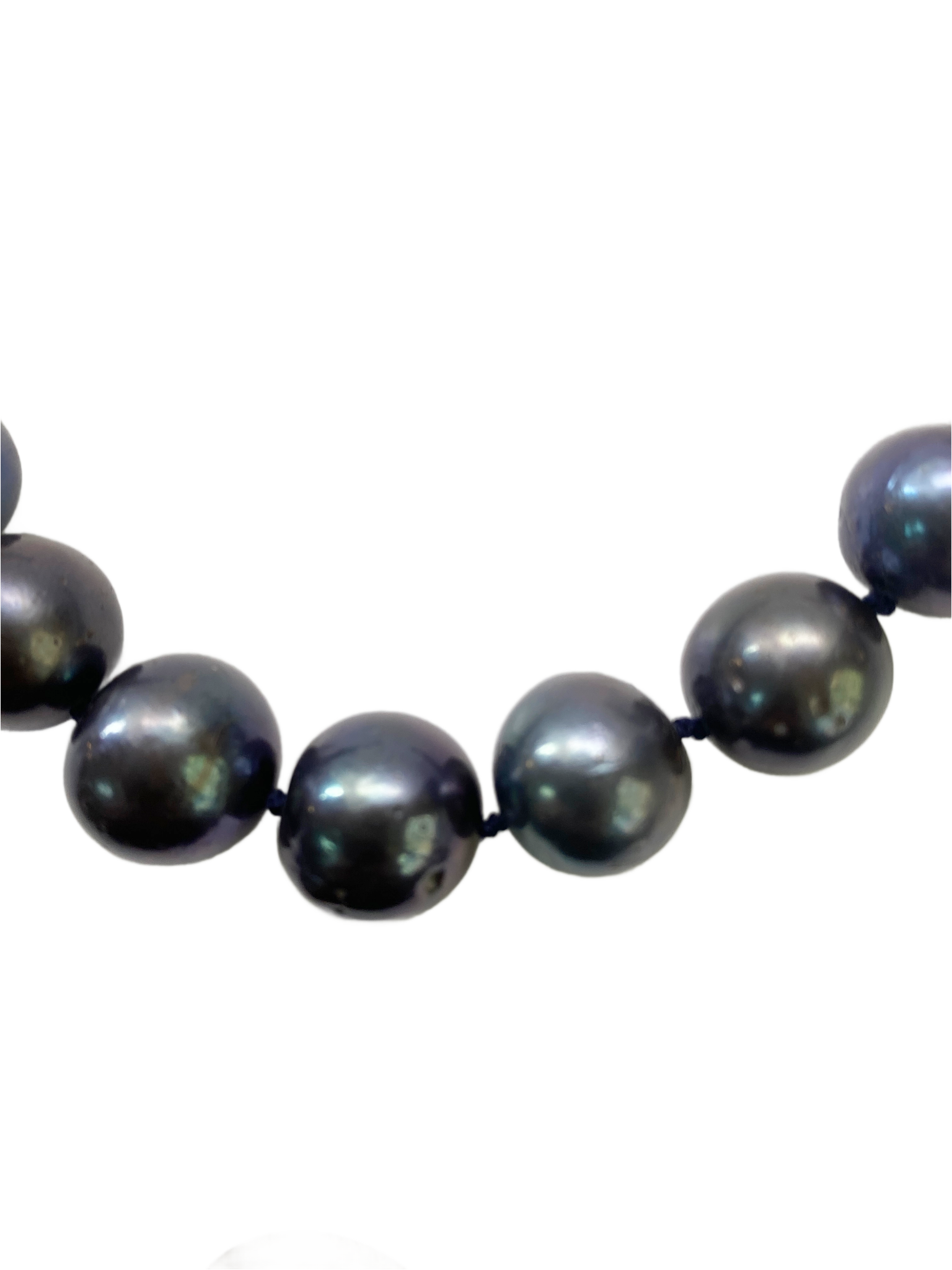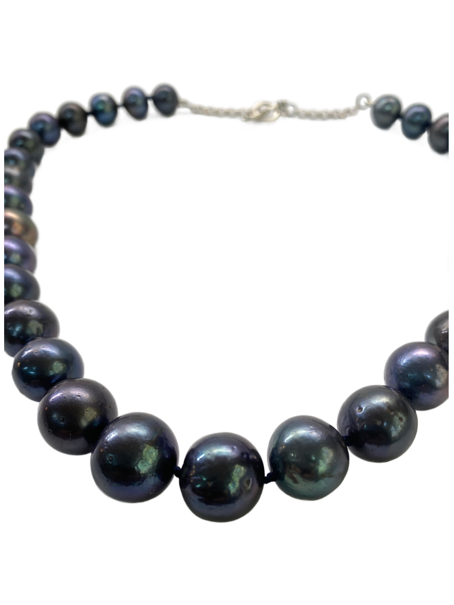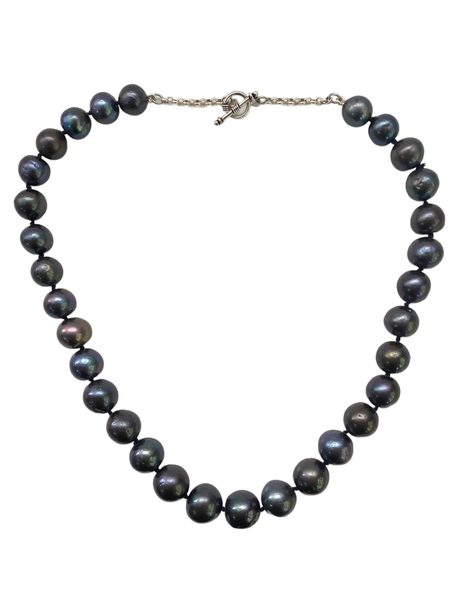 Make a bold statement with this AAA Black Pearl Necklace, showcasing a striking gradient of 10mm to 20mm freshwater pearls that command attention. The luminous black pearls paired with a sleek .925 sterling silver toggle clasp create an edgy yet refined look. At 18 inches, this necklace challenges convention and adds daring sophistication to your style.