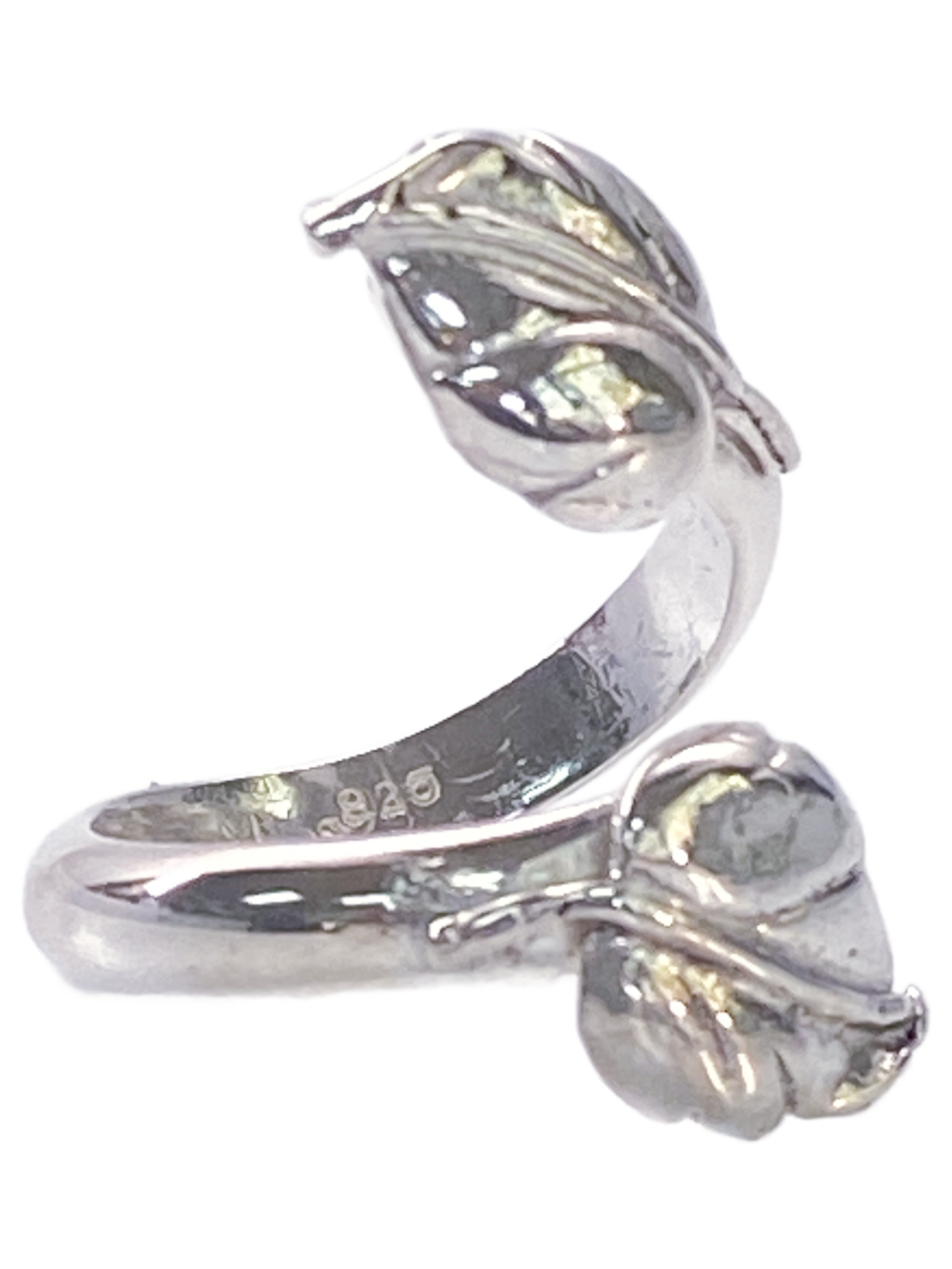 Crafted from .925 sterling silver, this whimsical leaf ring celebrates nature's charm with a playful twist. Each piece is hand-made and entirely unique, featuring an organic leaf design that adjusts to fit size 6.75. A one-of-a-kind treasure for those who love botanical beauty and artisanal craftsmanship.