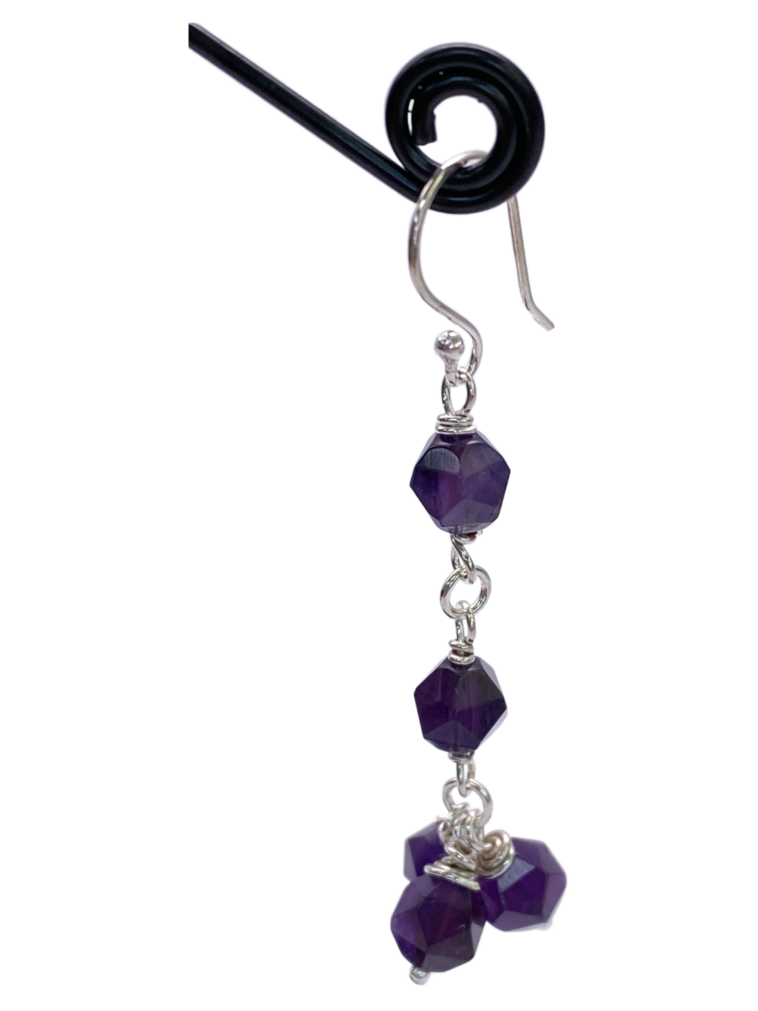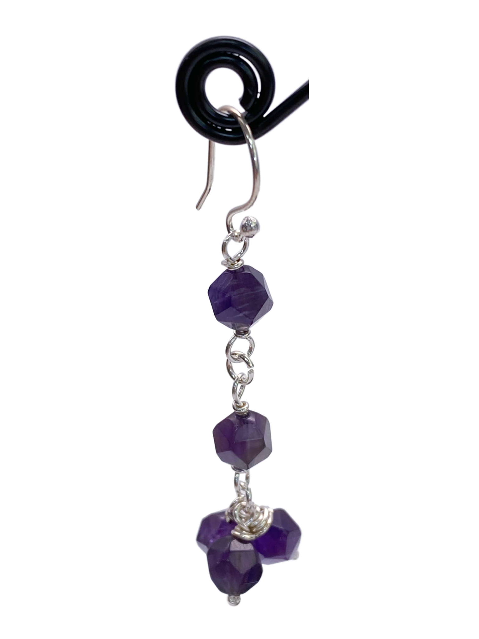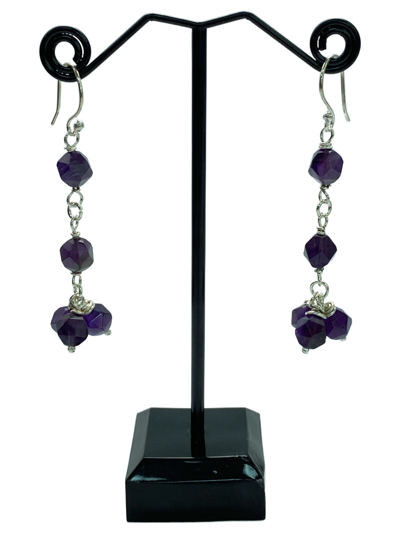 These Amethyst & Sterling Silver Dangle Earrings feature a linked design crafted from high-quality sterling silver, showcasing faceted amethyst beads that catch the light with subtle brilliance. Expertly made, they combine elegance and durability, making them a refined choice for those seeking timeless sophistication in their jewelry collection.