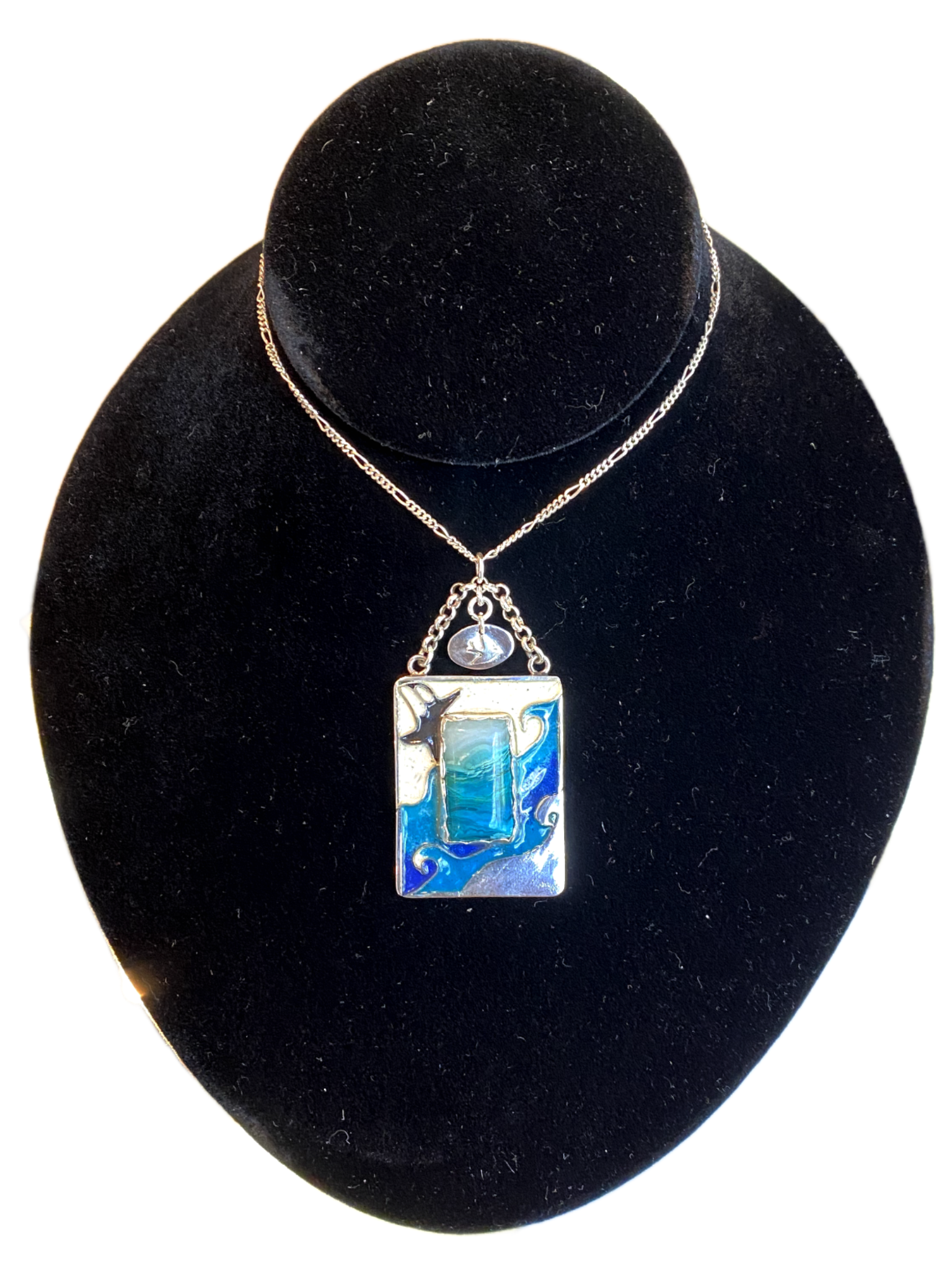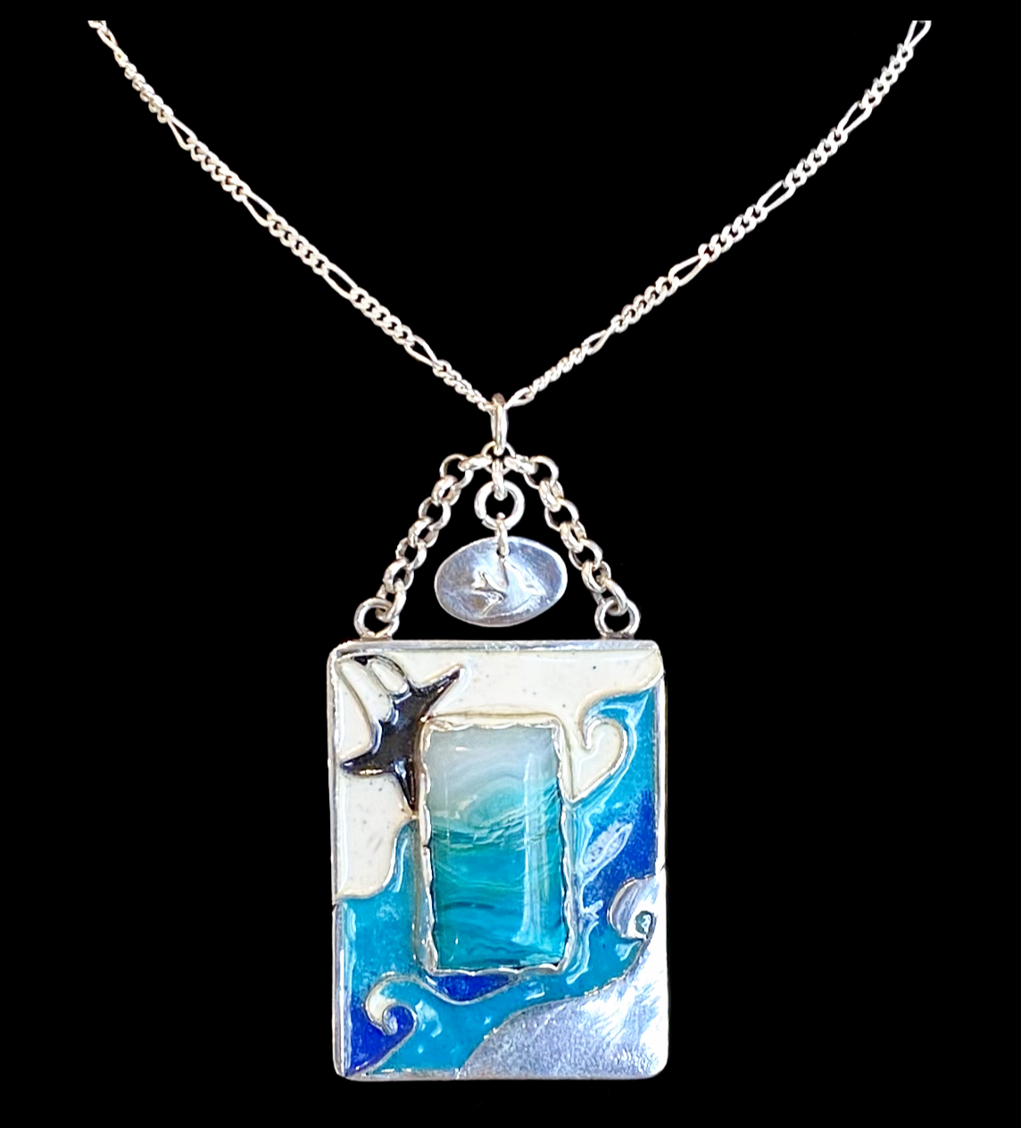 Crafted by hand using rare silica mine stone and vibrant cloisonné enamelled glass, the Georgia Straight Pendant captures the spirit of the orca whales migrating past Vancouver Island. Inspired by the powerful journeys along the Georgia Strait near Qualicum Beach, this pendant boldly celebrates nature’s wild elegance and your connection to untamed waters.