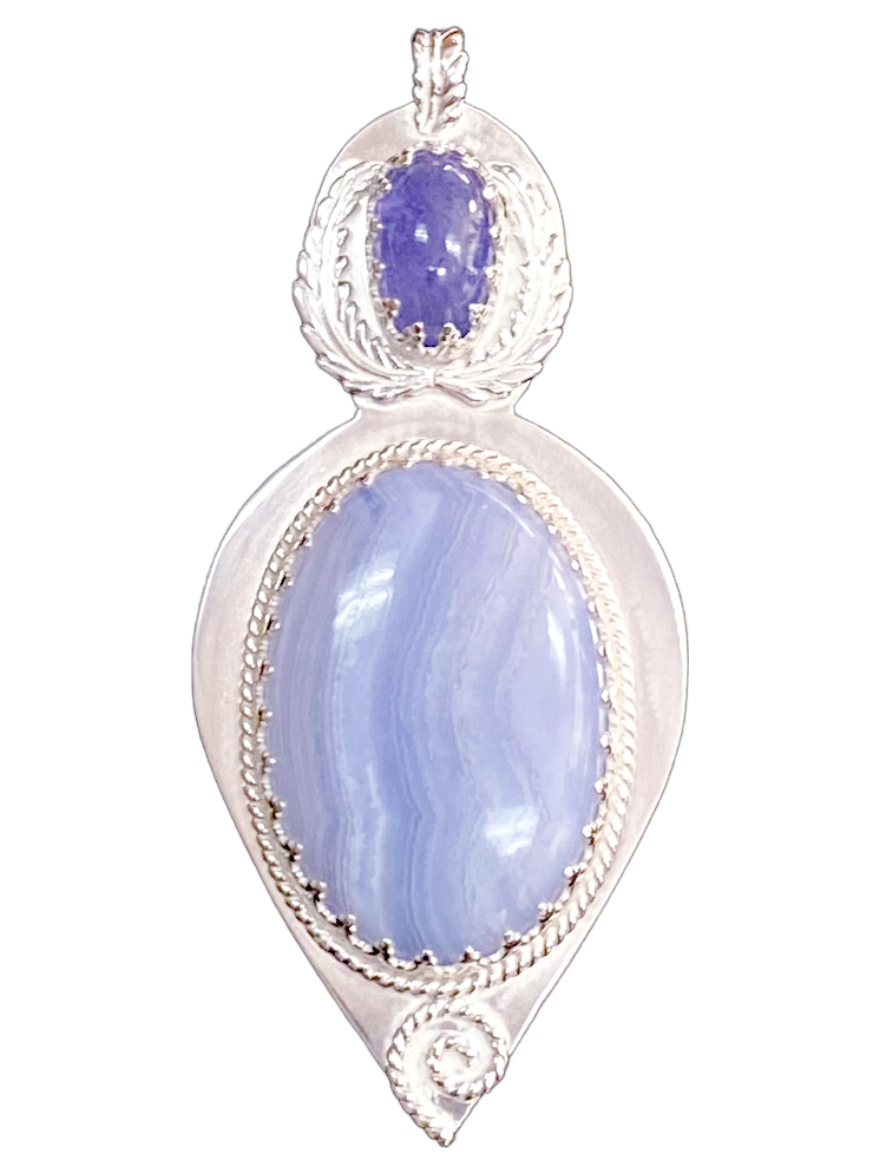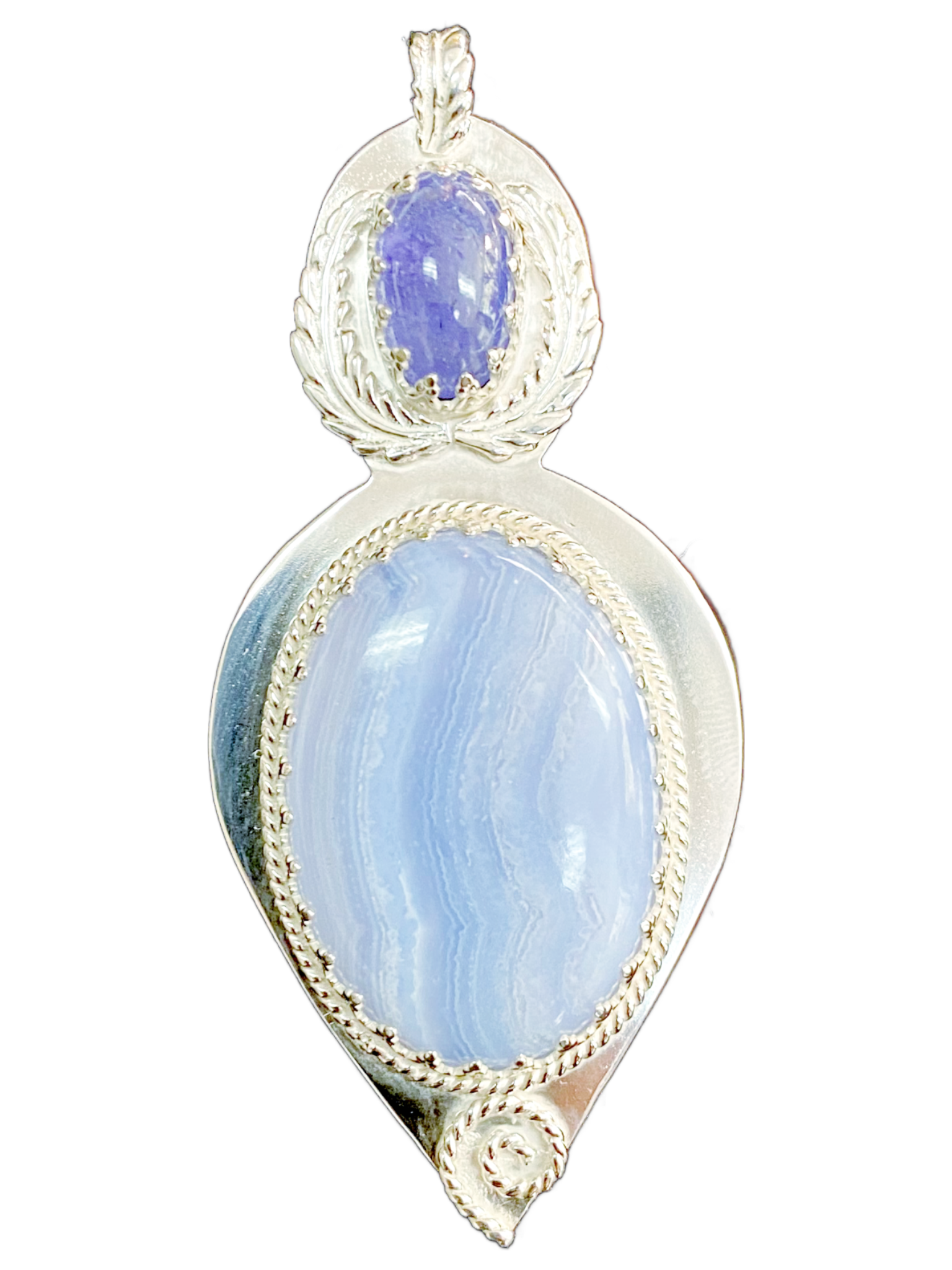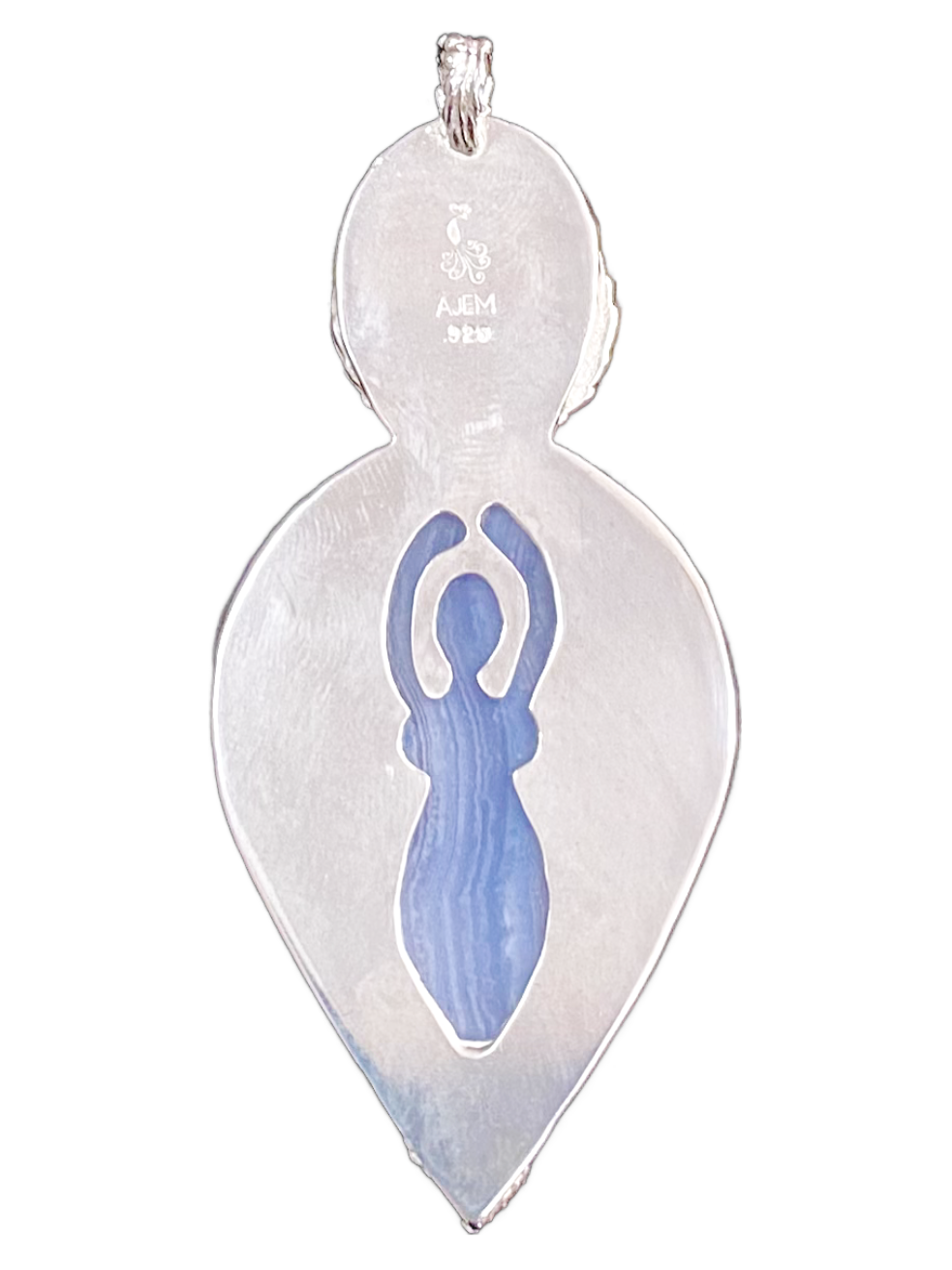 Reveal your inner strength with the Goddess Rising Pendant. Featuring radiant blue lace agate and sumptuous tanzanite set in sterling silver, this double-sided pendant captures a bold, mystical energy. The goddess motif shines through on the back, symbolizing empowerment and fearless beauty. Wear it as your statement of daring spirit and grace.