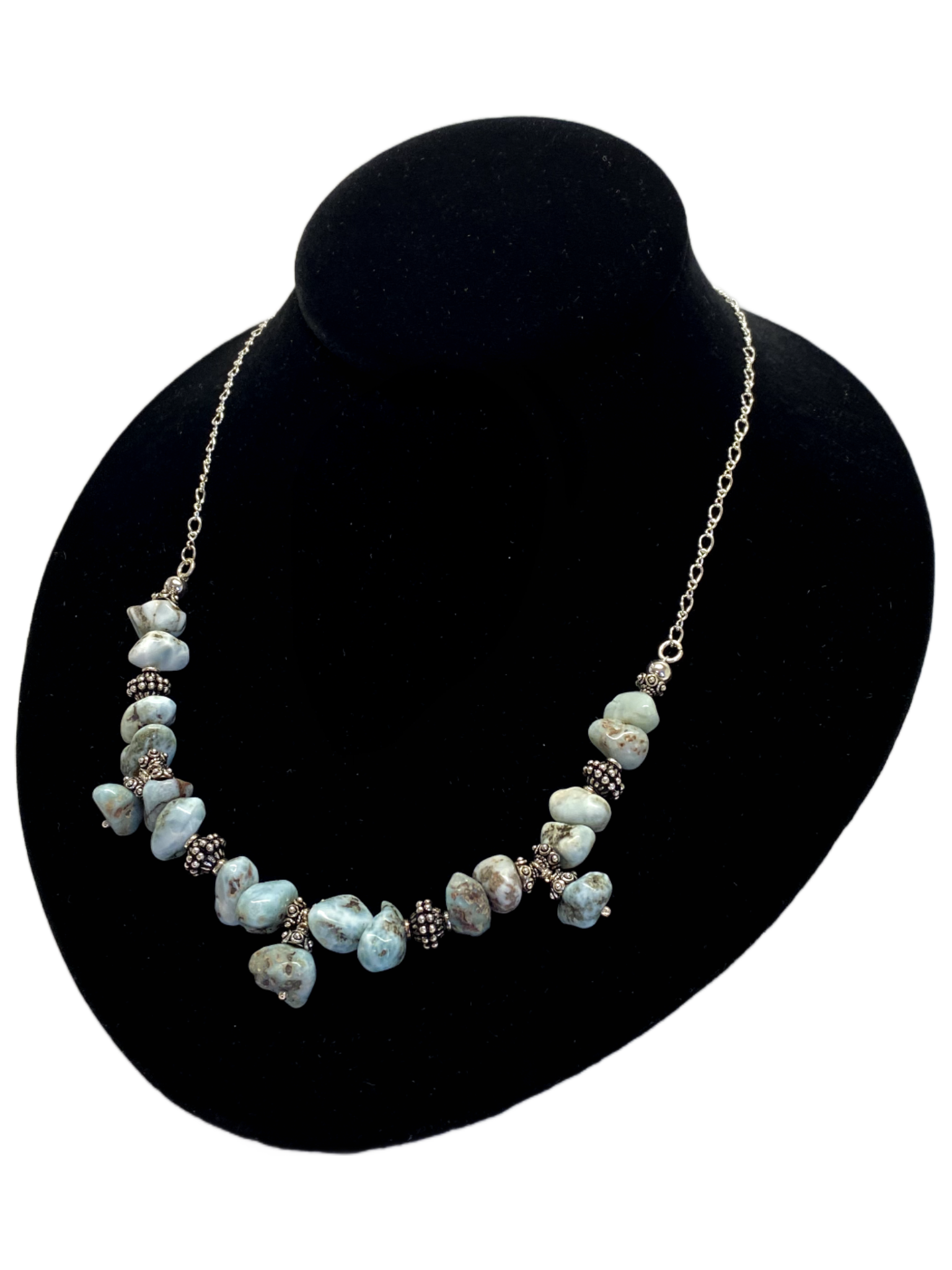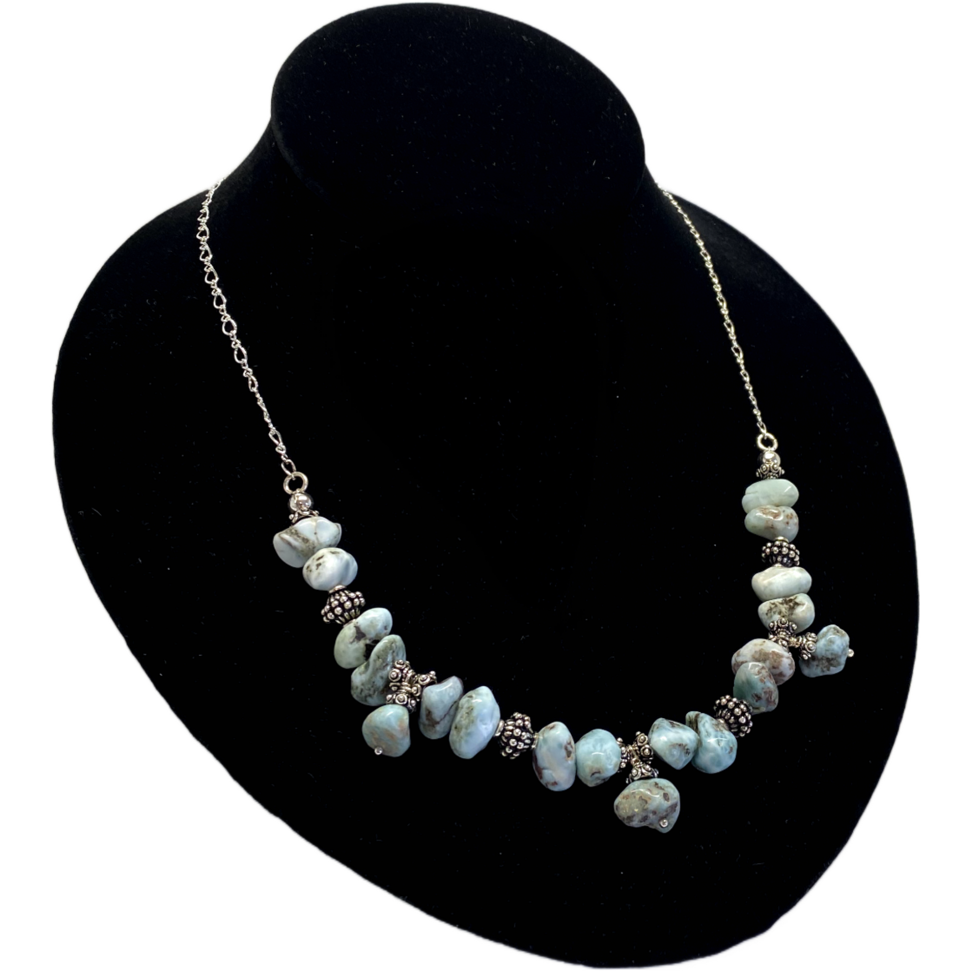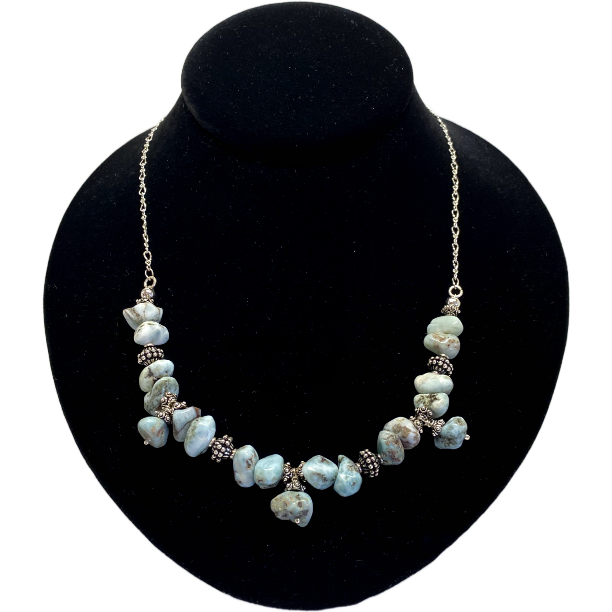 This handcrafted Larimar necklace features natural nugget stones paired with a sterling silver chain and delicate bead accents. Each piece is one of a kind, showcasing the unique blue hues of Larimar that evoke serene beach vibes. Expertly designed, it offers a refined yet relaxed accessory perfect for adding a touch of coastal elegance to any outfit.