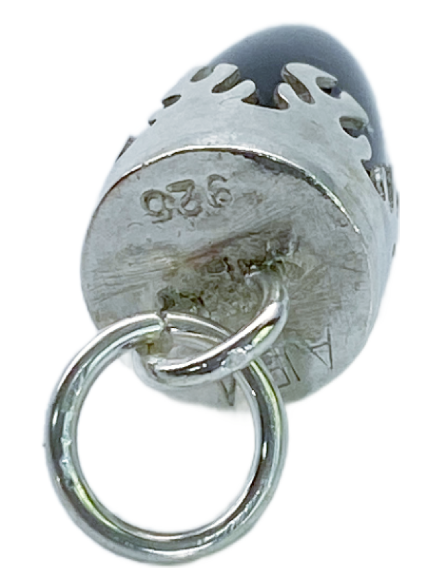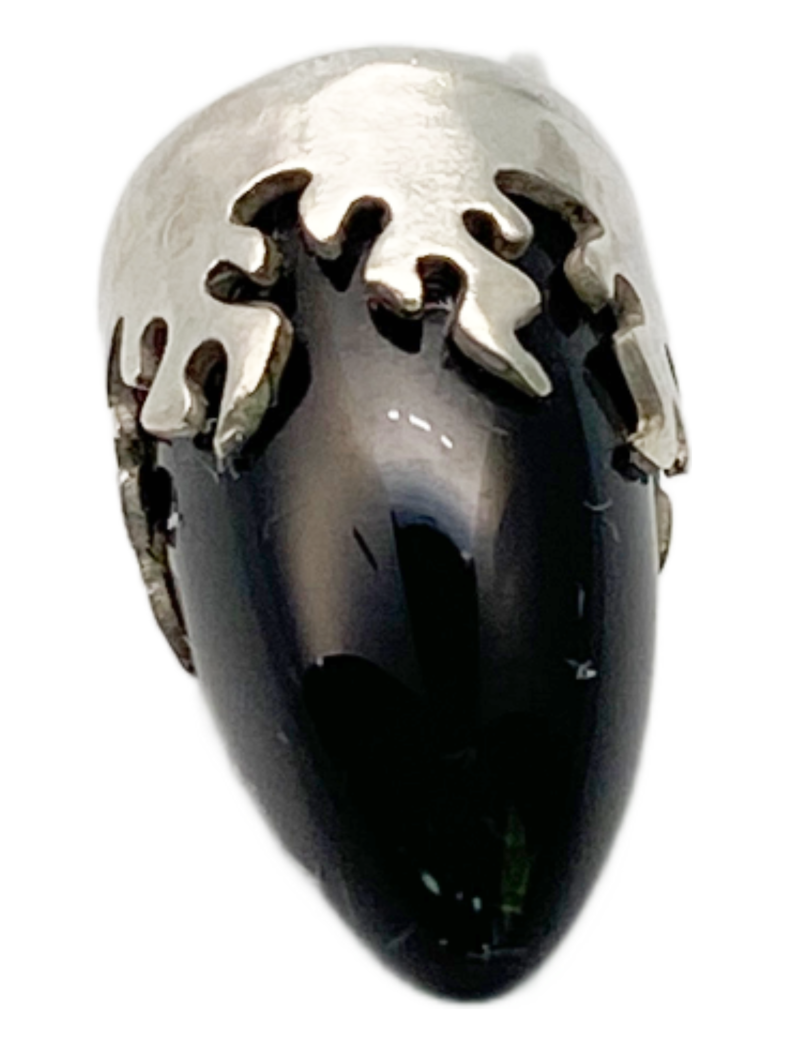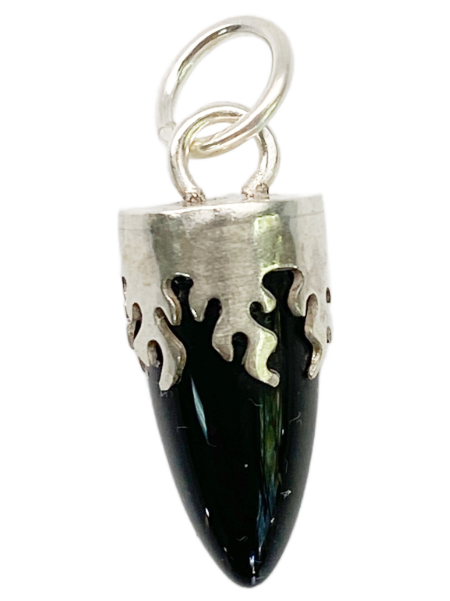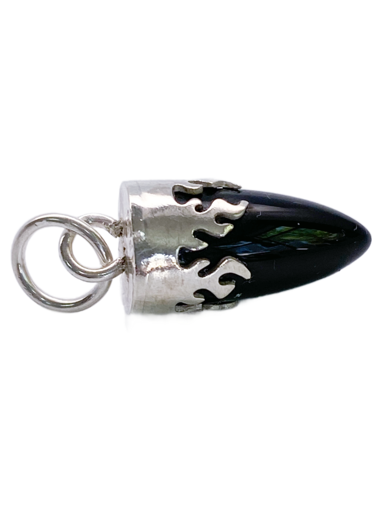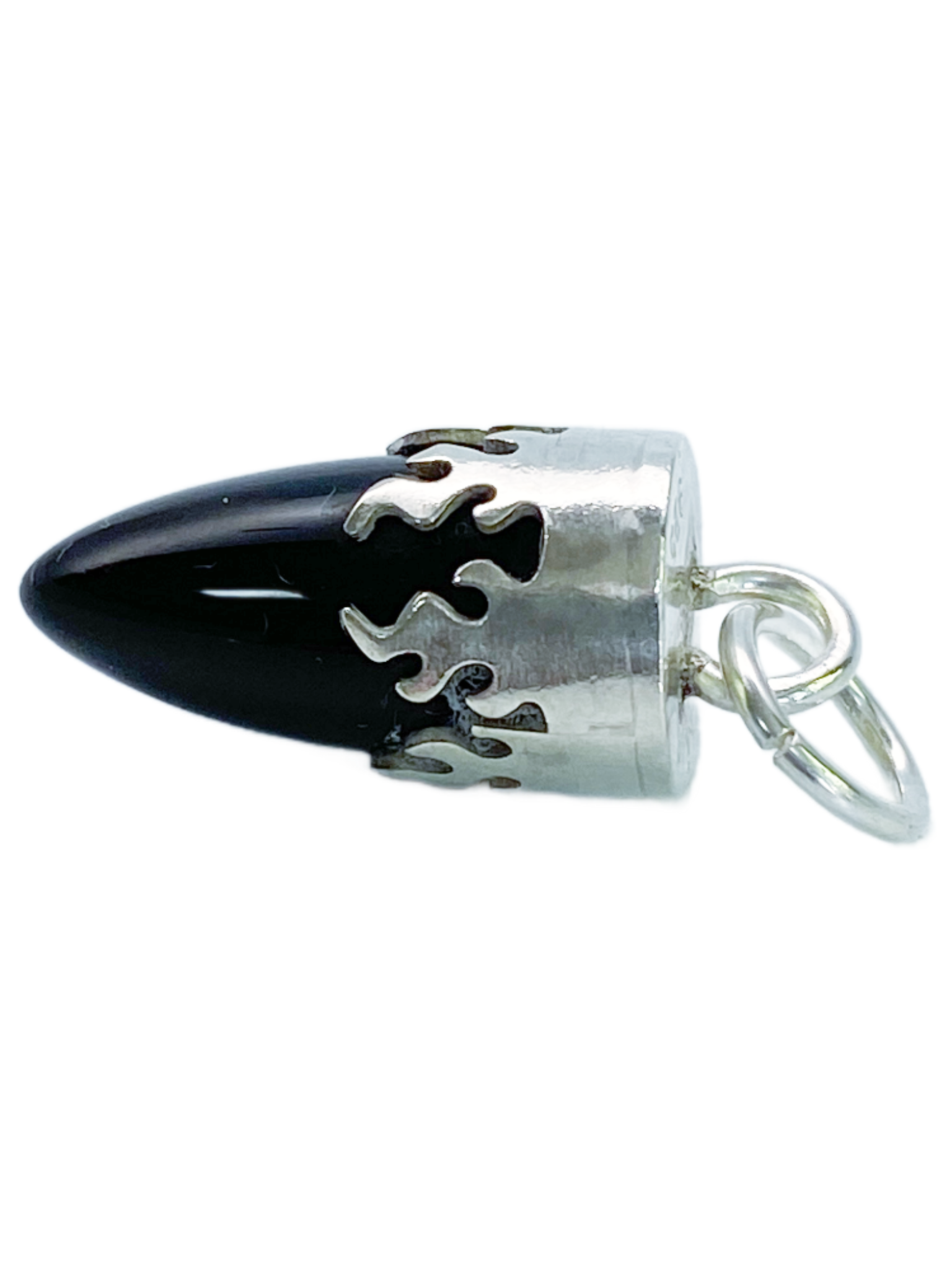 Make a bold statement with the Onyx Bullet With Silver Flame Pendant, where dark elegance meets fierce design. The smooth onyx bullet contrasts strikingly with the sleek silver flame, creating an edgy yet subtle accessory that elevates any look. Perfect for those who dare to stand out with understated intensity.