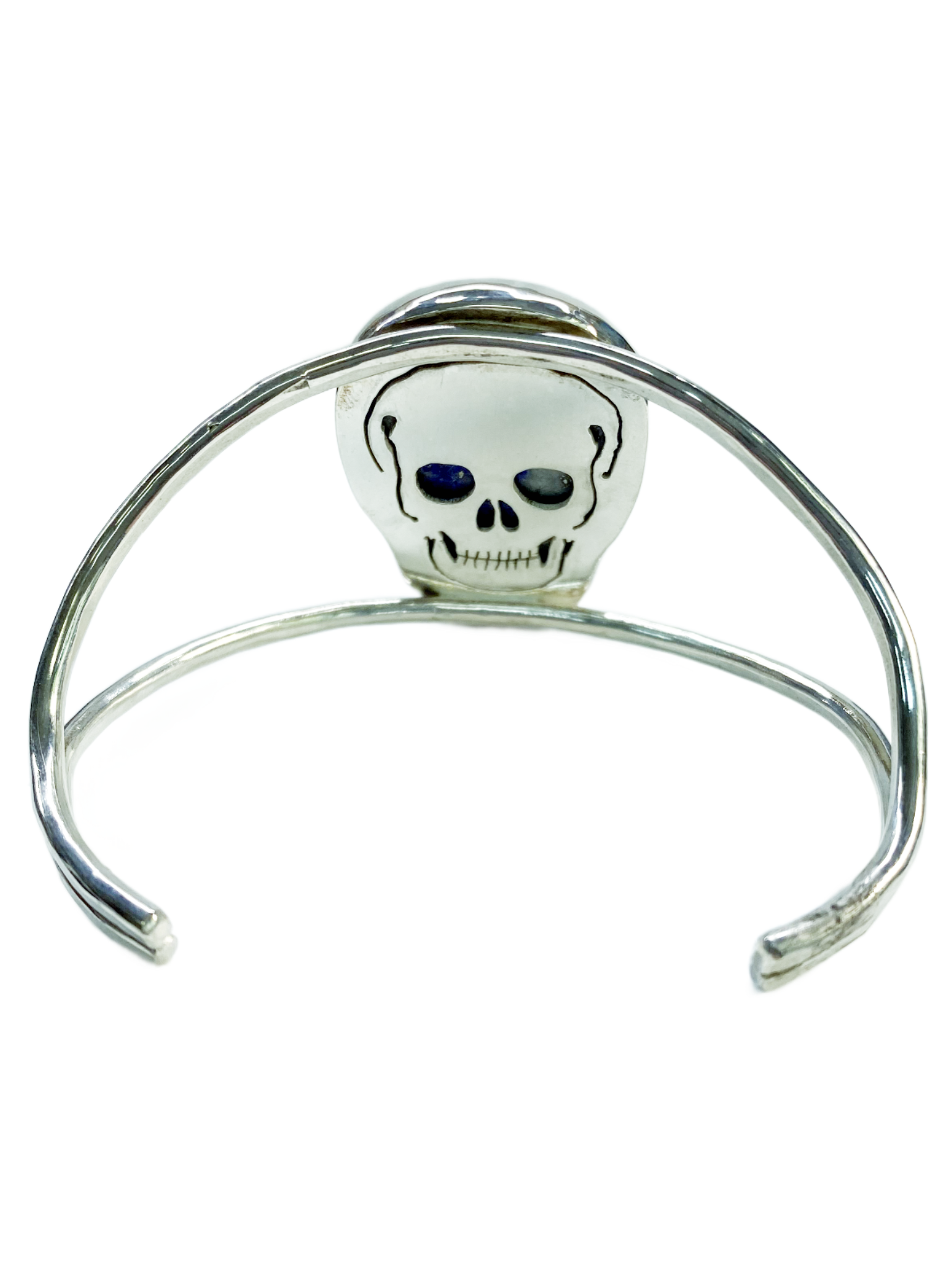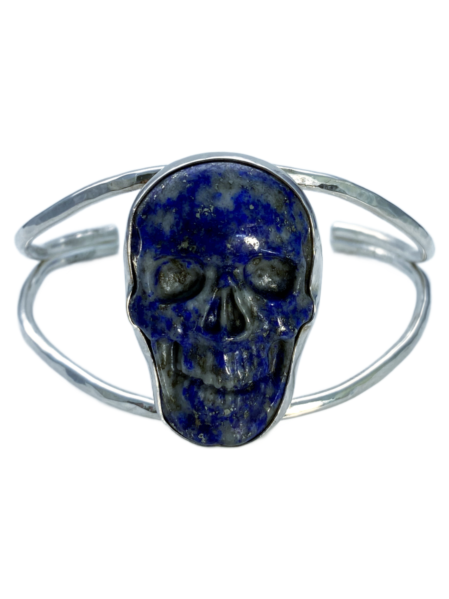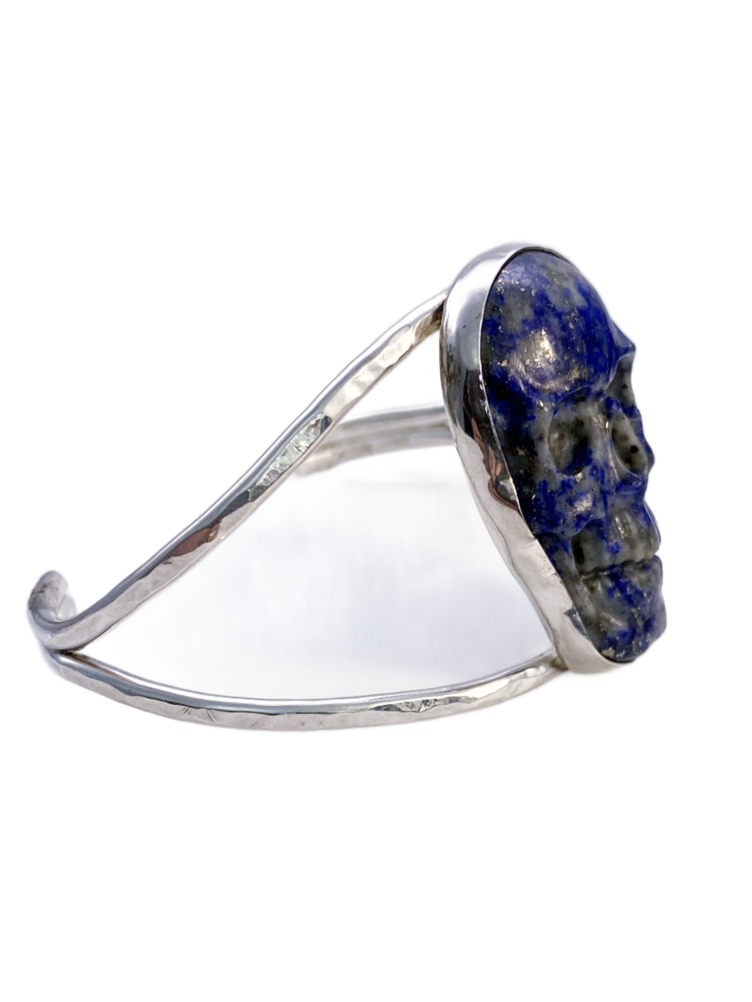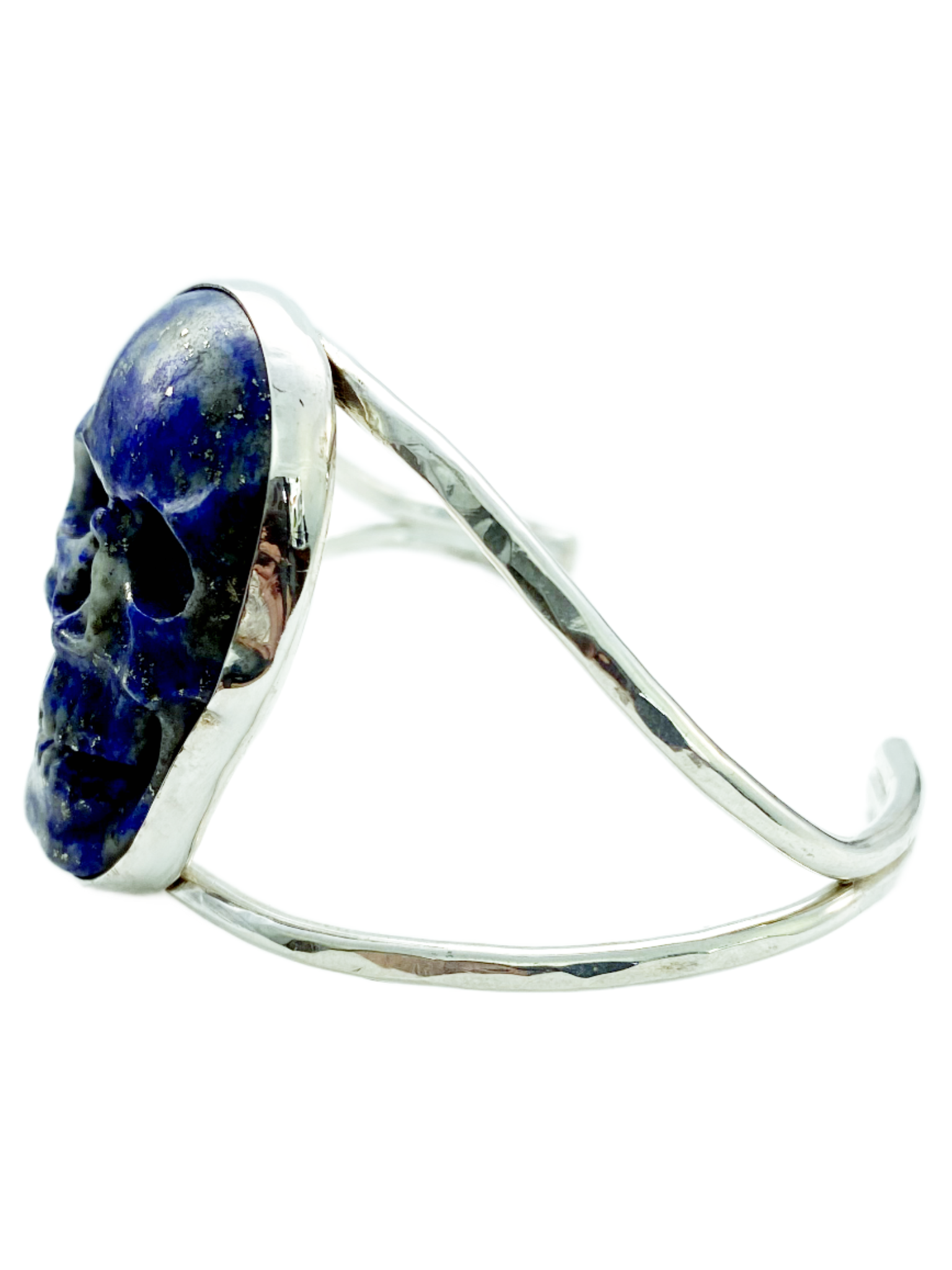 This Silver and Hand-Carved Lapis Skull Cuff Bracelet showcases expert craftsmanship with its intricately carved lapis lazuli skull centerpiece set in polished silver. Designed with a gothic and edgy aesthetic, it offers a unique blend of artistry and bold style. Ideal for those who appreciate distinctive, handcrafted jewelry that makes a strong statement. One of a kind.