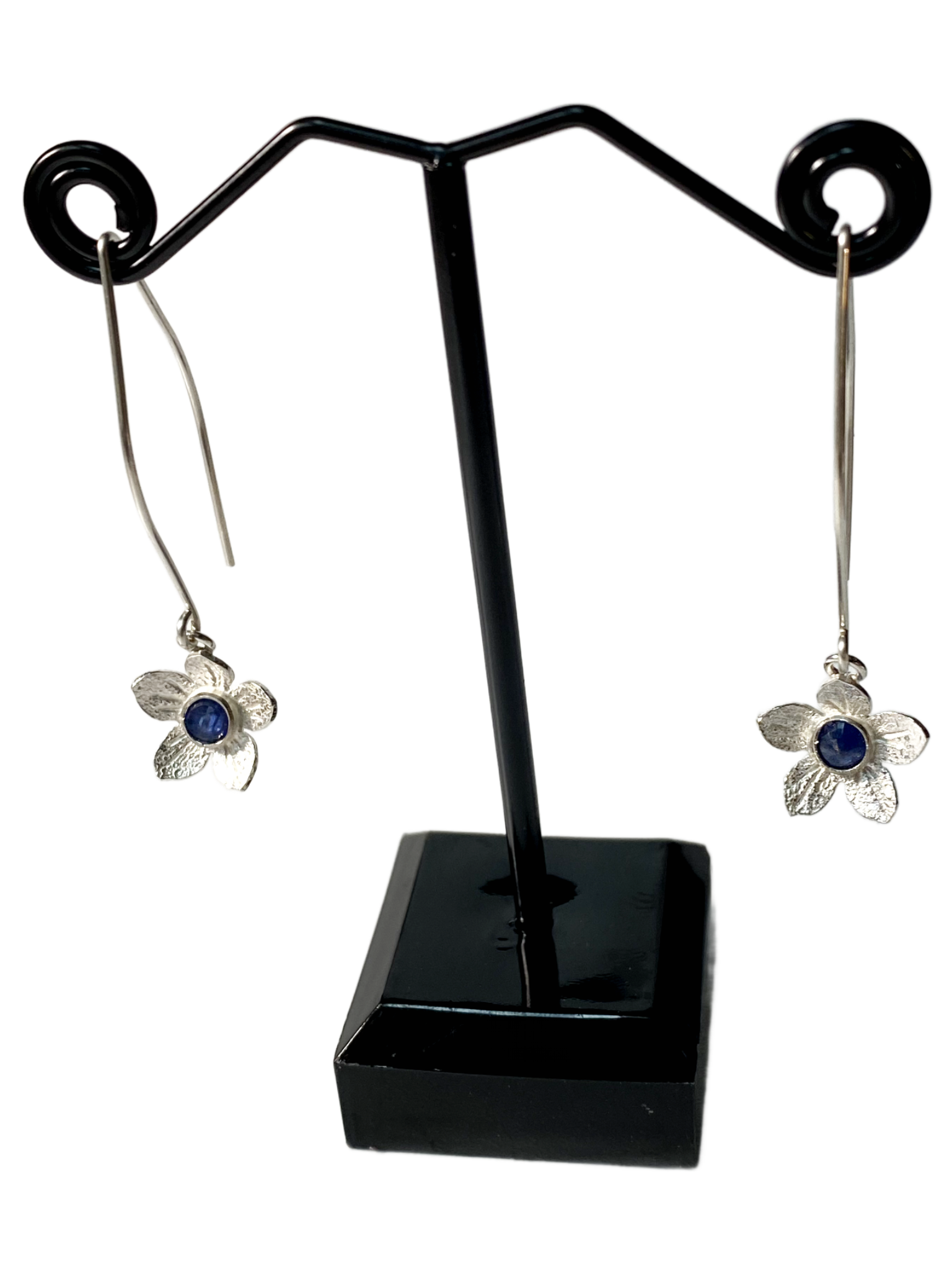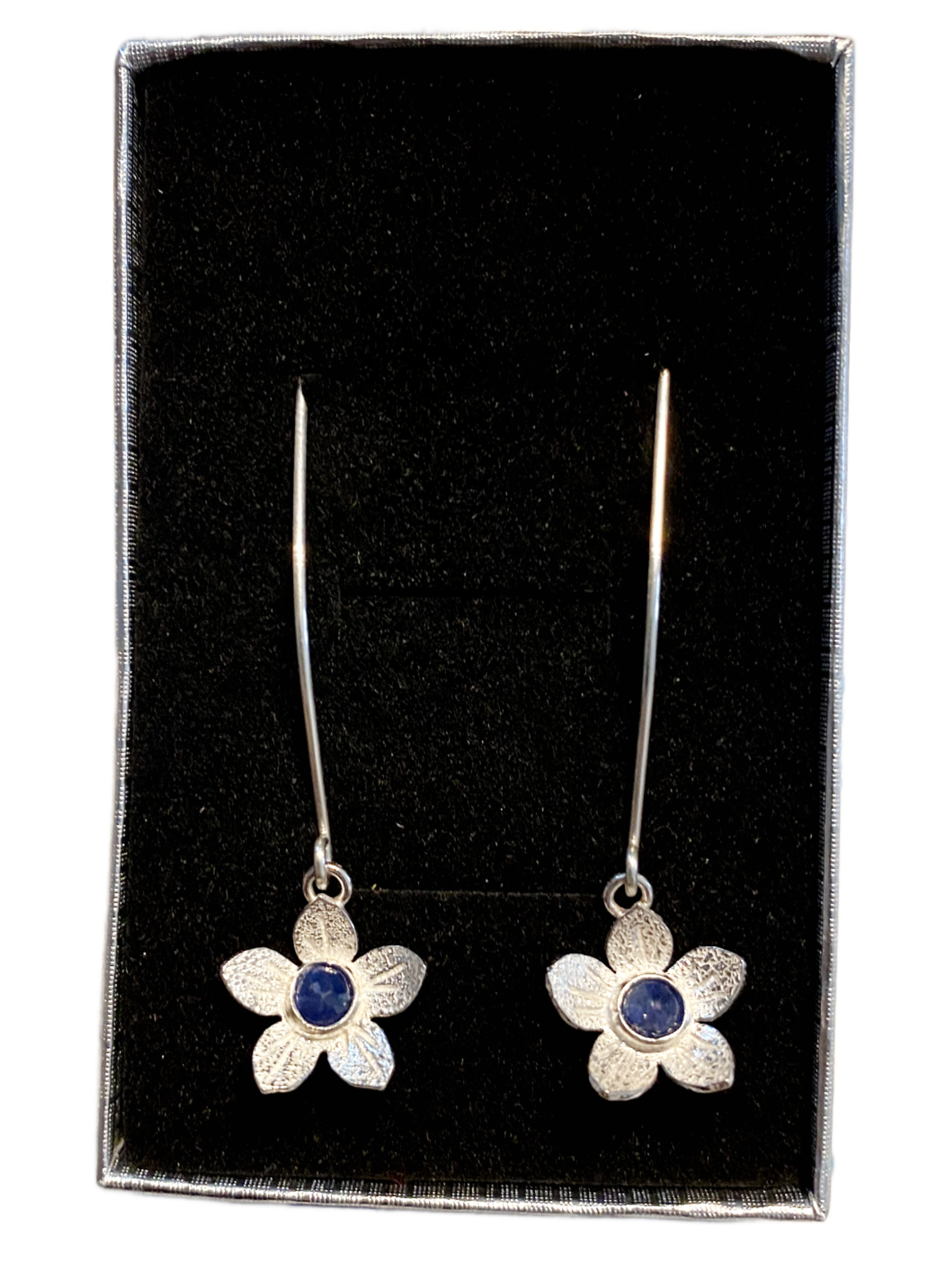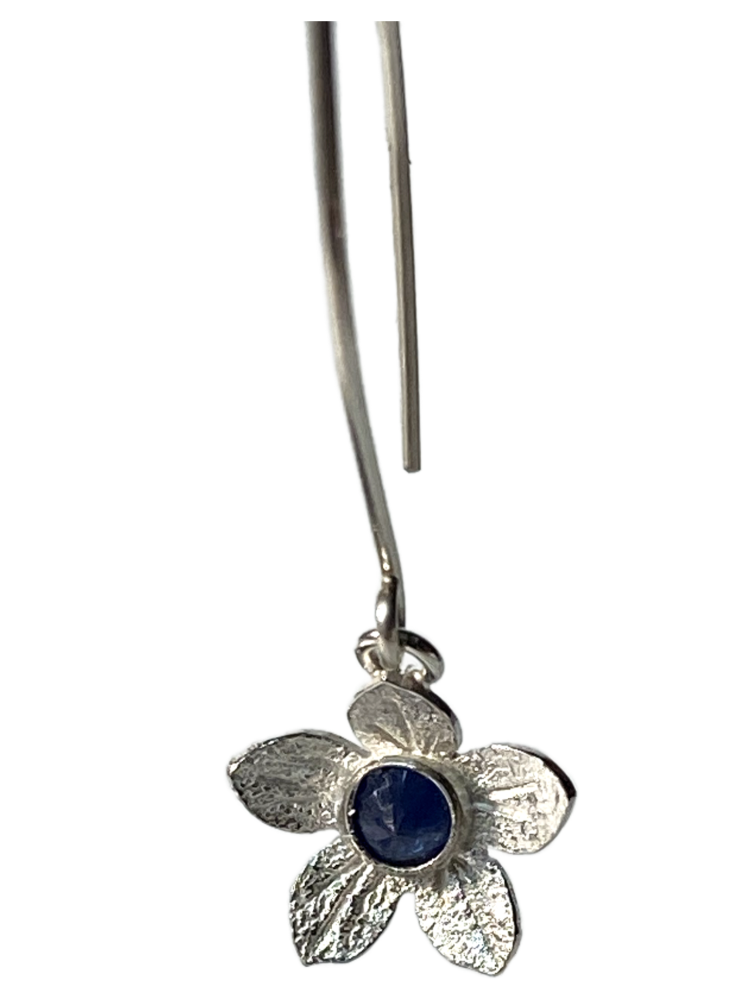These Blue Sapphire Flower Earrings feature large ear wires crafted from reticulated silver, offering a unique textured finish. The delicate floral design is enhanced by vibrant blue sapphires, combining elegance with artisanal detail. Perfect for those seeking a refined yet distinctive accessory.