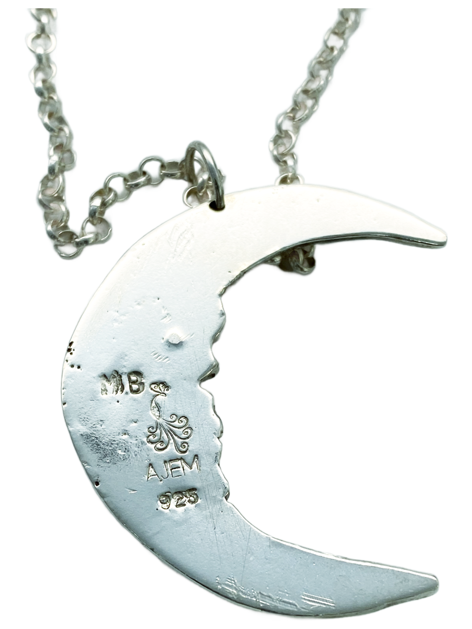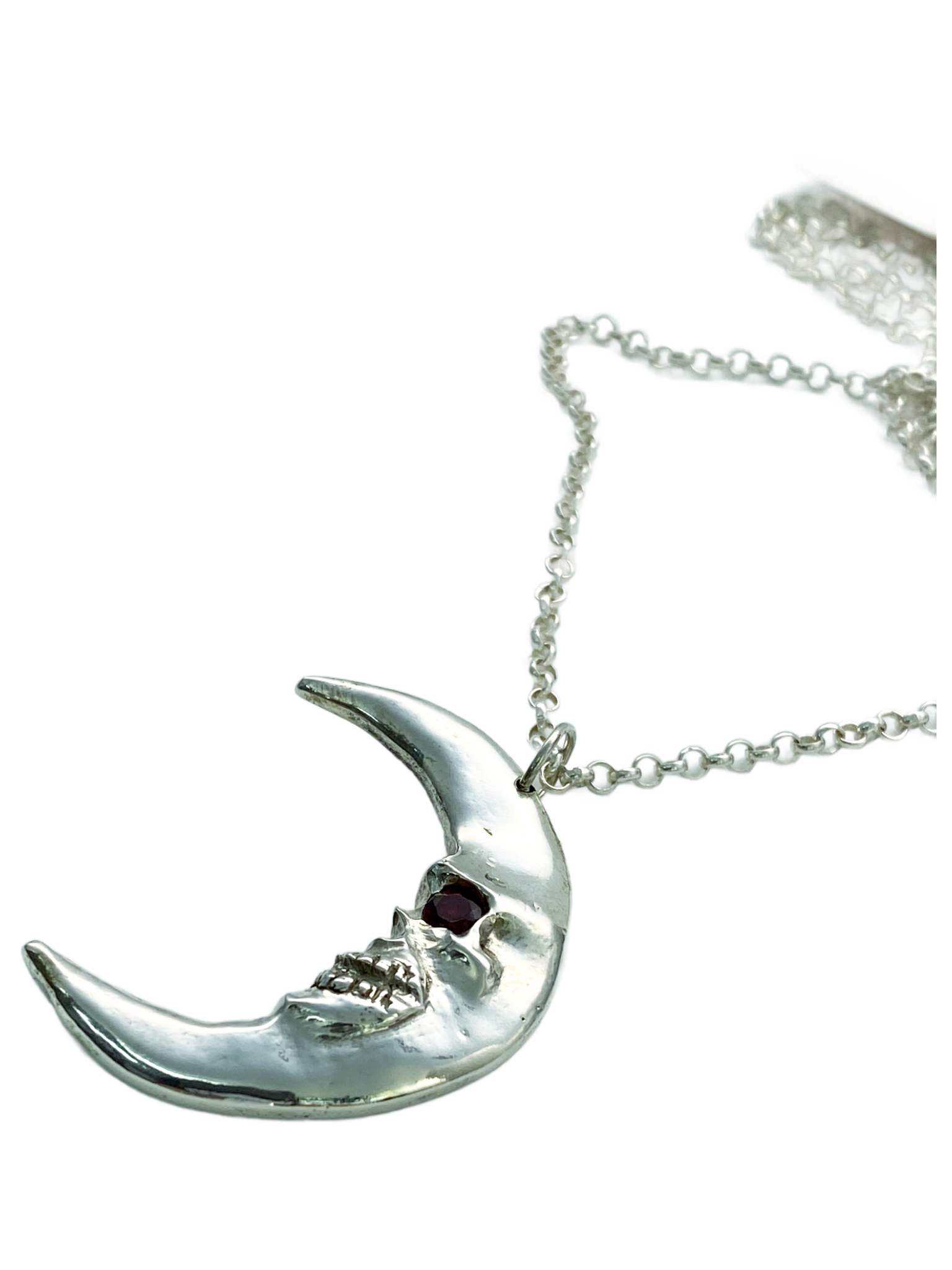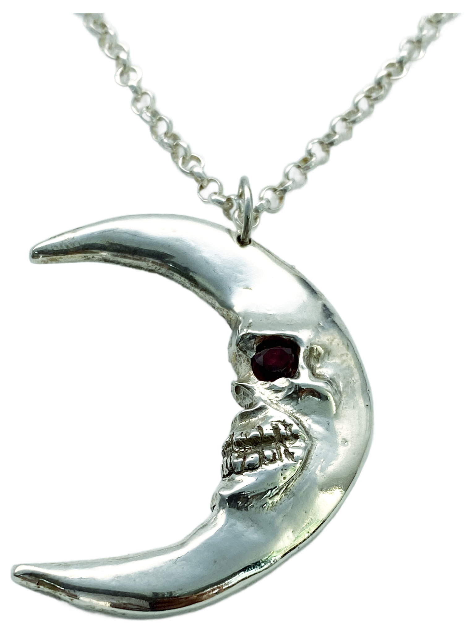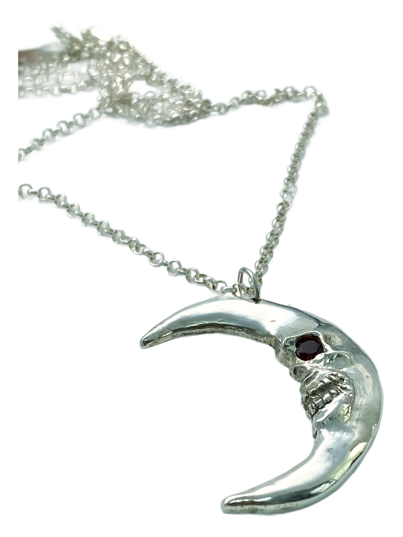 This one-of-a-kind Silver Skull Crescent Moon pendant features a captivating garnet eye, embodying gothic elegance with expert craftsmanship. Its unisex design makes it a distinctive statement piece, perfect for those seeking a unique accessory that blends bold symbolism with refined style.